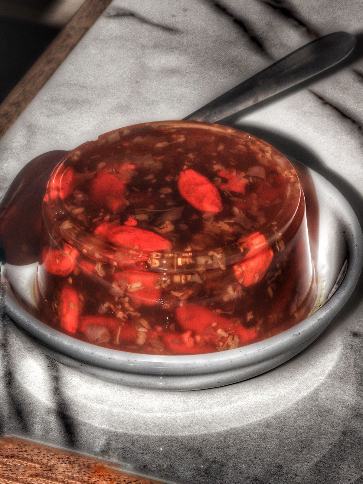 I’m calling all of these foods jellies - striking in appearance, ambiguous, glossy forms that were born from resourcefulness and craft, persisting in part due to their perceived benefits in traditional Chinese medicine. In the Eastern practice, balancing one's energy (qi) through cooling (yin) and warming (yang) foods aids digestion, skin health, circulation, and the like.