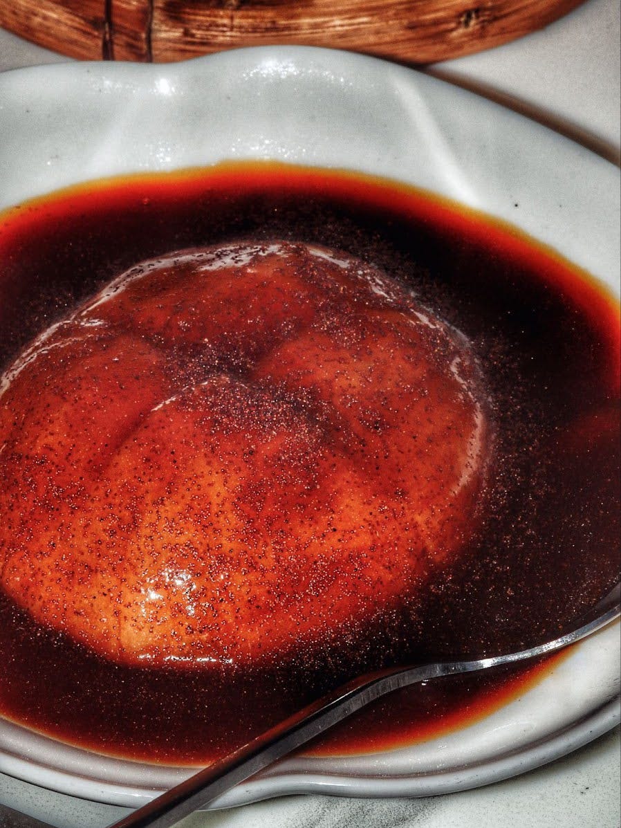 This might be because of the meticulous preparation: thick, fibrous sheaths of pomelo skin are first repeatedly soaked overnight, rinsed, and blanched to leach out bitterness. Then, the pith is braised in a deeply savory soy + red bean curd broth until it yields elegantly like sculpture medium to a spoon, saturated with comforting flavor to its brim.