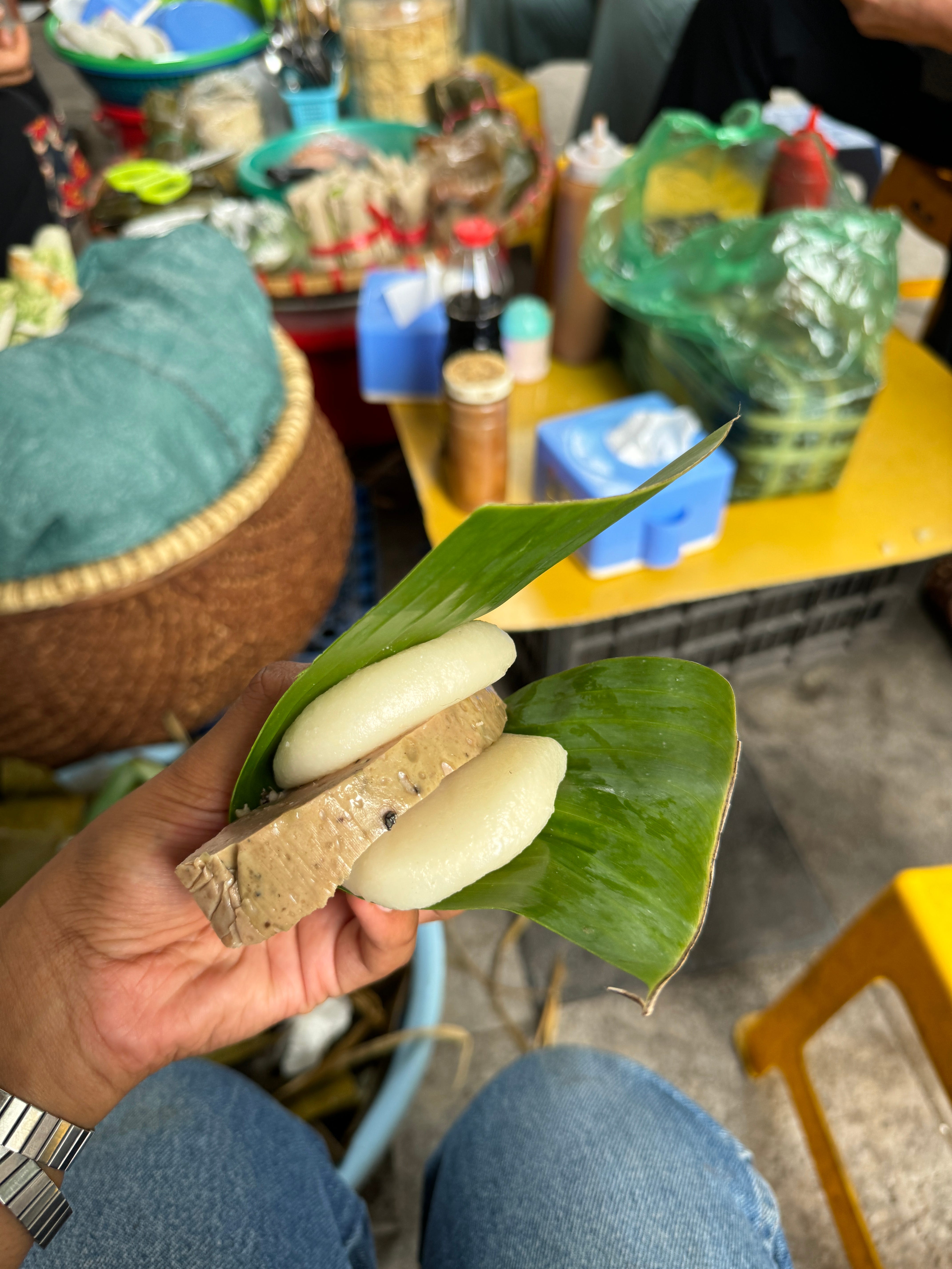 Bánh Giầy is a chewy Vietnamese snack made from glutinous rice, similar in texture to mochi, often enjoyed alongside chả lụa (pork sausage). It’s loved for its dense, sticky chewiness and is related to other traditional snacks like bánh chưng (sticky rice with mung bean and pork) and bánh giò. Served with either a spicy or sweet chili sauce, bánh giầy is the ultimate snack for qq lovers.