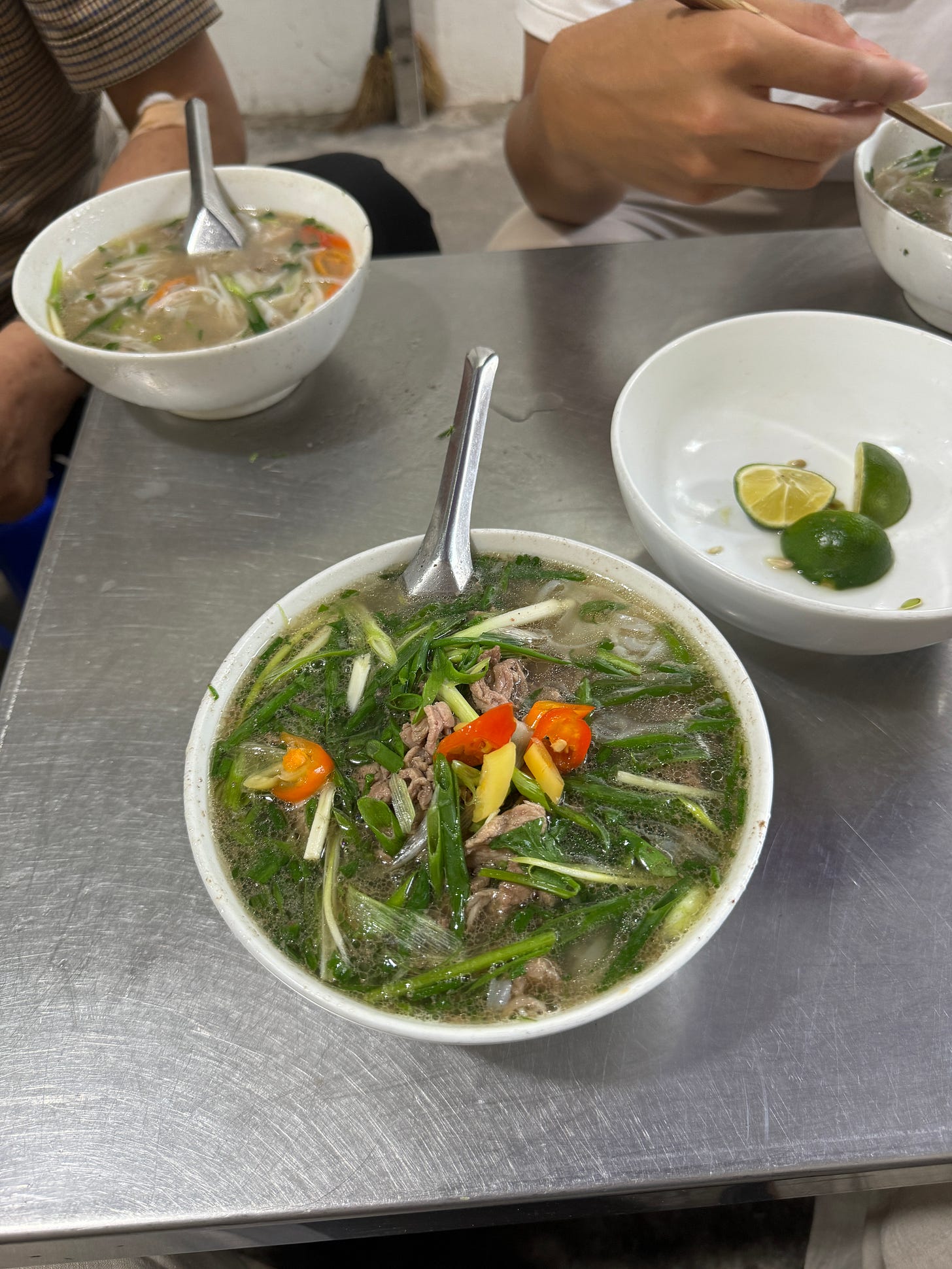 At the table, you’ll usually find pickled garlic, fresh lime wedges, sliced bird’s eye chilies, and fermented chili sauce – different from the toppings you’d find in southern Vietnam which includes sugar & hoisin sauce (similar to what you’d find in pho restaurants outside Vietnam due to the mass immigration of Southern Vietnamese after the fall of Saigon).