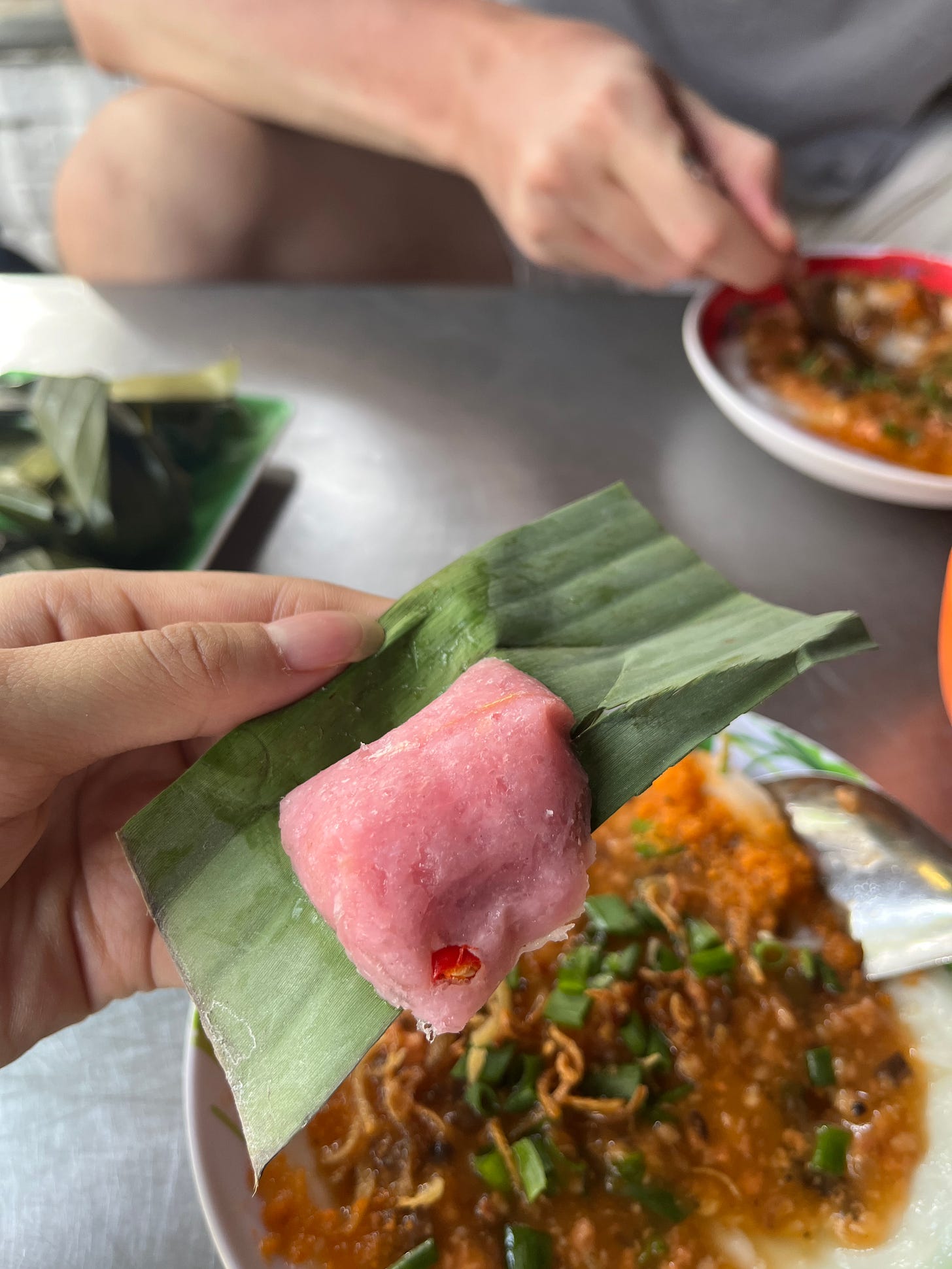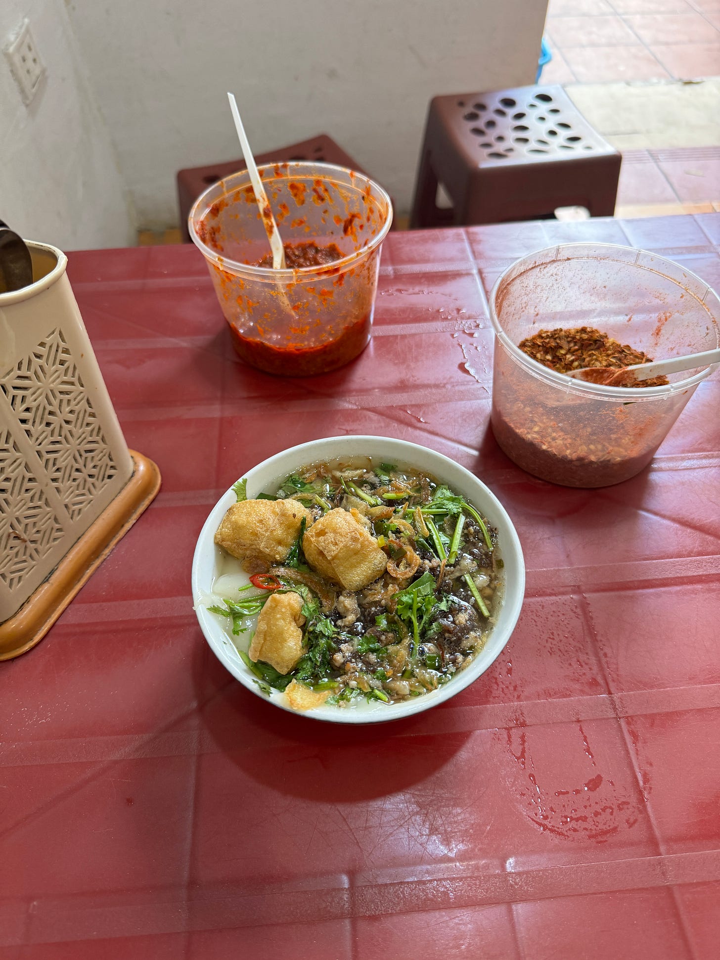 Bánh đúc is a sticky rice porridge made from glutinous sticky rice and stickier in texture compared to cháo (rice porridge). It is typically seasoned with fish sauce, pork, and black pepper, and topped with fresh herbs and chili for added flavor and freshness.